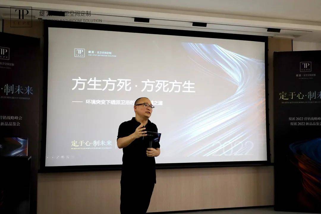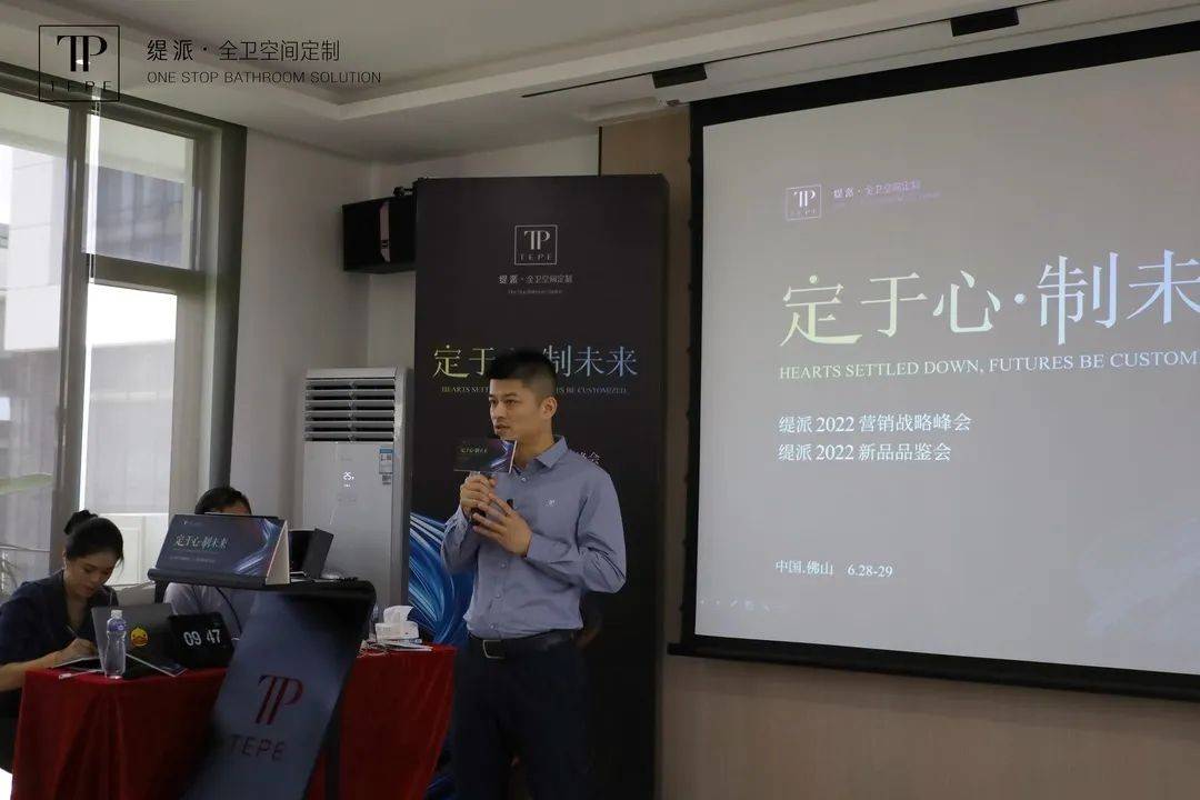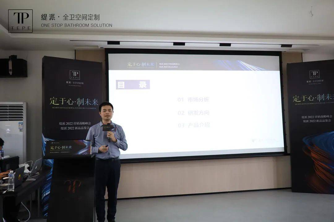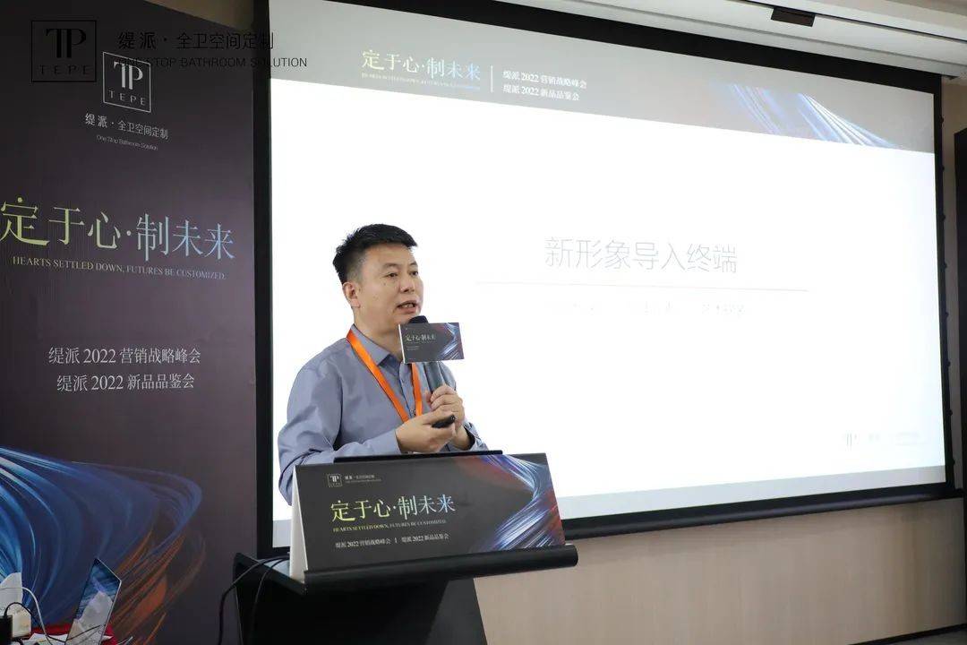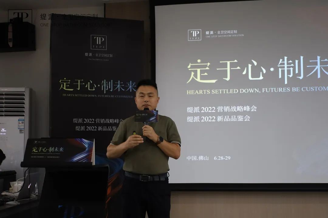 随后,TEPE缇派卫浴品牌总经理李劲松、TEPE缇派卫浴市场部总监王海南分别就卫浴行业现状结合缇派卫浴的破局之路作了深度解析,从团队、品牌、产品定位、渠道建设、终端运营、培训帮扶政策等方面分析了TEPE缇派卫浴未来发展之路,并向经销商团队深度剖析讲解了TEPE缇派卫浴2022年度营销战略规划。李总提到:面对变化多端,用户要求逐渐提高的卫浴市场,TEPE缇派卫浴要开启“定制3.0”时代,以用户思维解决产品定制问题。