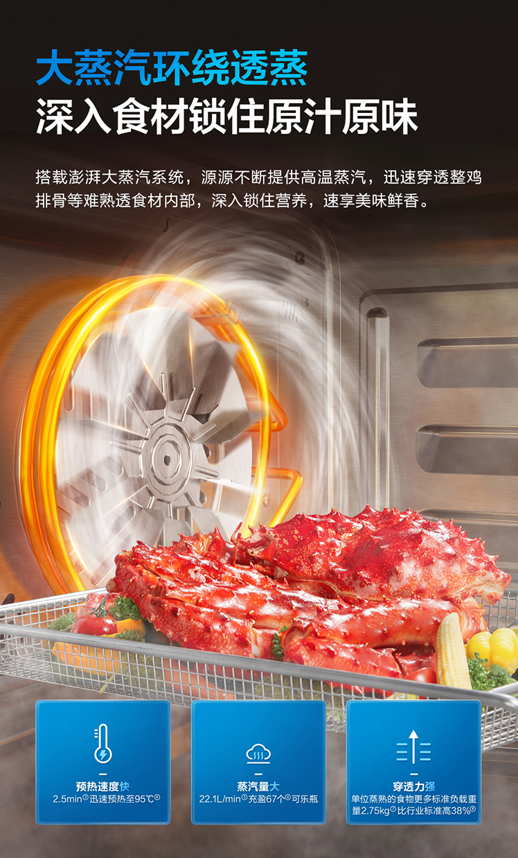 蒸,是烹饪中非常讲究原汁原味,营养健康的方式,但其实传统的蒸制虽然能保证原汁原味,却难以高效脱油脱脂,而搭载了老板澎湃大蒸汽系统的CQ9161,拥有22.1L/min的大蒸汽量,蒸烤组合加热的方式让其能够在2.5min之内预热至95℃,并能负载多达2.75KG的食材,强大的性能也让CQ9161能够实现高达150℃的高温蒸,既能够快速穿透大块肉类等食材,蒸得更熟的同时锁住鲜香口感,同时对比同类产品100℃的蒸制温度,其脱油率可提升214.9%,真正对“油”物说再见。并且CQ9161的顶部、底部都有辅热设计,在蒸制时,顶部不滴水,底部积水少,保证了蒸制效果且便于打理,尤其在使用CQ9161的复热功能时,对比传统微波加热,复热出的食物可以恰到好处的恢复到接近刚出锅时的口感。CQ9161用行动作答蒸烤一体机哪个牌子好这一问题。