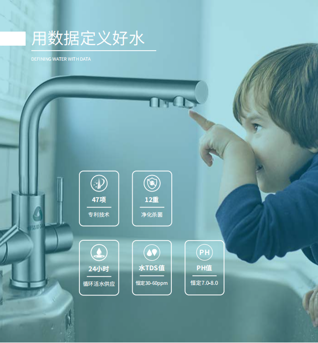 核心过滤系统采用反渗透及纳滤过滤技术,滤除水中细菌、病毒、毒素等有机物及重金属、无机盐等无机物,并结合纳滤的选择性过滤,保留水中的有益矿物质元素。