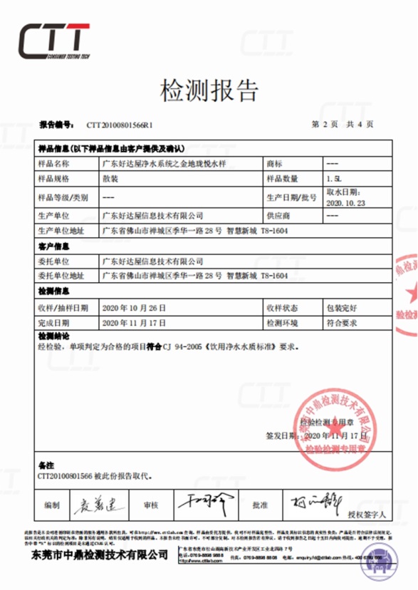 为确保检测结果的绝对公正与透明度,好达屋入户直饮水水质检测的采样均由用户提供与确认,并委托东莞市中鼎检测技术有限公司进行权威水质检测,杜绝一切舞弊与作假现象。