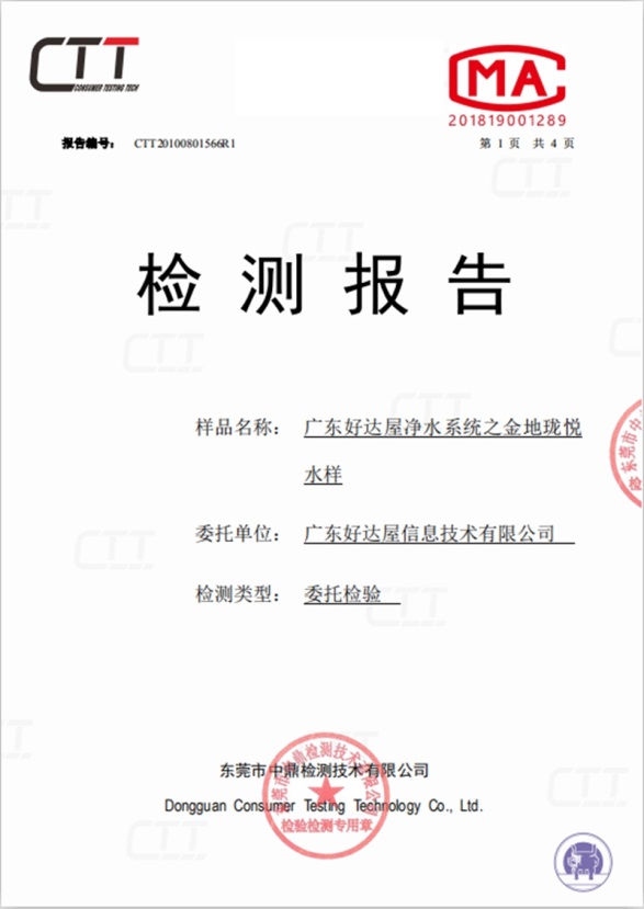 除了自身的严苛品控,为了将“用户体验”最大化,好达屋入户直饮水推行“水质自检+聘请第三方检测”双管齐下,希望通过这种方式消除用户的安全顾虑与健康担忧,真正实现好水惠及千万家庭的企业远景。本次最新水质检测报告委托具备政府相关部门认可资质的专业CMA检测机构进行鉴定与检测,检测结果具备法律效力。